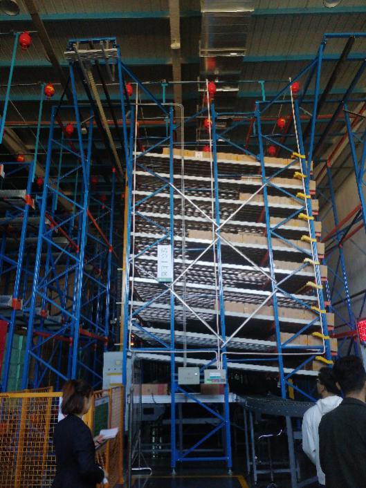 作为重点消防安全单位,配送中心在参观开始前专门安排本单位安全工程师胡主任向我们讲述了安全注意事项。接下来,姚老师带领同学们参观仓库,详细介绍了配送中心出入库、分拣及包装作业中所使用的自动化设备。箱烟到达仓库后,先按批次录入系统,使用伸缩链板机送入自动叠烟机将件烟码垛到托盘,然后使用自动堆垛机存入密集式仓储区域。密集式仓储能够大大节省占地面积,提高仓库存储密度。出库作业时,用自动堆垛机将托盘从密集仓储区取出,再用拆烟机拆跺,还原成入库前的件烟形式,送入储分一体区进行缓存,等待分拣。之后按订单配送线路和配送顺序进行分拣。分拣系统采用双线设计,柜式、立式、卧式多种分拣机相结合,划分118个分拣通道,大幅度提高工作效率。配送中心采用软塑周转箱对分拣后的订单进行包装,周转箱可重复使用300多次,降低了包装费用,践行了绿色环保理念;使用自动装箱、自动打码、自动贴标等先进技术,极大地提高了工作效率。仓库还采用了多项自主创新技术,实现降本增效。