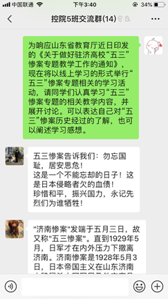 各硕士、博士团支部分别以线上、线下学习的形式举行了“五三”惨案专题学习活动。博士支部按照实验室分组特点,采取了线上学习“五三”惨案的形式进行自我教育。观看完“五三”惨案的ppt和视频之后,同学们进行了慷慨激昂的讨论,2016级博士苏同学说:“五三”惨案是中国近代史上发生在济南的重大历史事件,把“五三”惨案作为我们学习历史的题材,有助于引导我们青年学生全面客观了解“五三”惨案,对于激发我们的民族自尊心、责任心,引导我们确立辩证唯物主义历史观,强爱国情、立报国志具有重要的现实意义,同时有助于增强思想教育的理论性、针对性和有效性。”