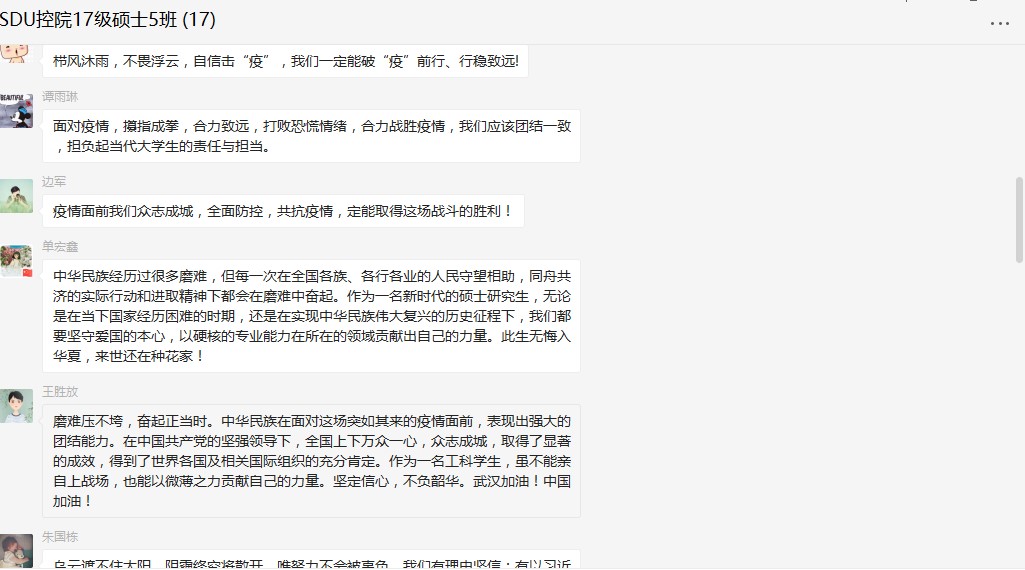 线上学习结束后,同学们通过微信群、QQ群等线上方式,展开了热烈的讨论,并撰写了学习心得,抒发了在防疫大战中坚定信心、不负韶华的青年责任和担当。