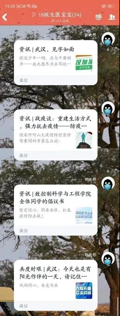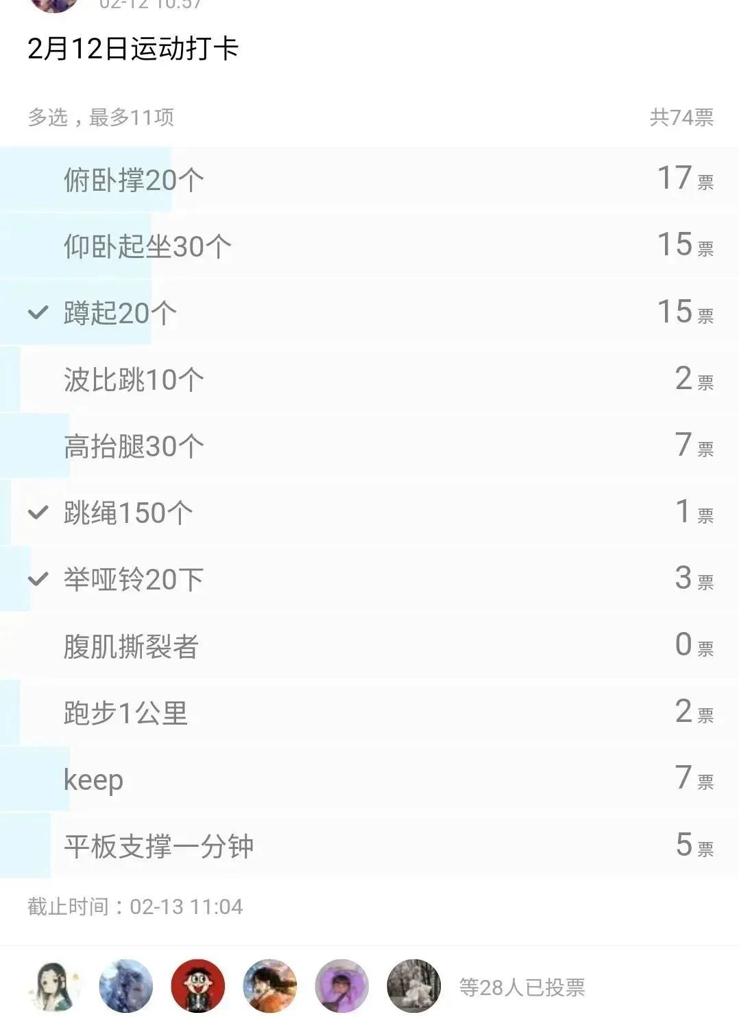 我们虽没有援助前线的能力,却有家国同心、华夏同情的信心和豪气。海报是传达感情的良好工具,为武汉制作加油海报便成了同学们声援武汉的有效方式。鉴于特殊时期无法外出锻炼,同学们的身体健康可能无法得到保证,为了加强锻炼,增强体魄,提高对包括冠状病毒在内的各种病原体的抵抗能力,班内实行了每日锻炼计划并在QQ群里实行每日打卡。