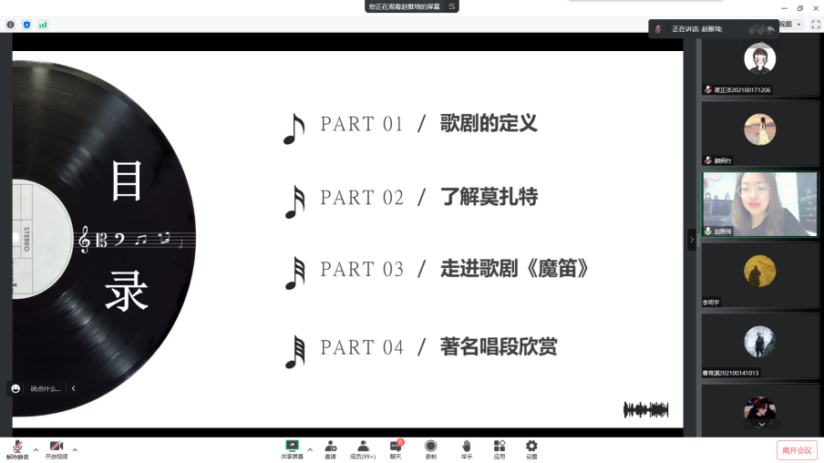 活动伊始,赵雅琦简单介绍了何为歌剧,以“歌剧和中国哪种艺术形式十分类似”的问题引导同学们展开思考,通过讲解莫扎特的人生故事,带领同学们走进伟大歌剧家的精神世界。赵雅琦为我们重点介绍了莫扎特最杰出的歌剧之一《魔笛》,生动讲述其创作背景、戏剧性和音乐性体现,用通俗易懂的方式引导同学们欣赏歌剧之美。《魔笛》是莫扎特最后一部歌剧,音乐语言丰富多彩,歌剧元素丰富,既带有正剧的严谨又包含着喜剧的灵活,它也是莫扎特对当时社会形态的象征性揭露,反映了以光明为象征的启蒙思想最终必定会胜利。大家一同欣赏歌剧《魔笛》的精彩片段,其中不同人物极具特色的表演,让人身临其境、大为赞叹,同学们在互动和聆听中,共同感受歌剧的艺术魅力,提升自我的审美素养。