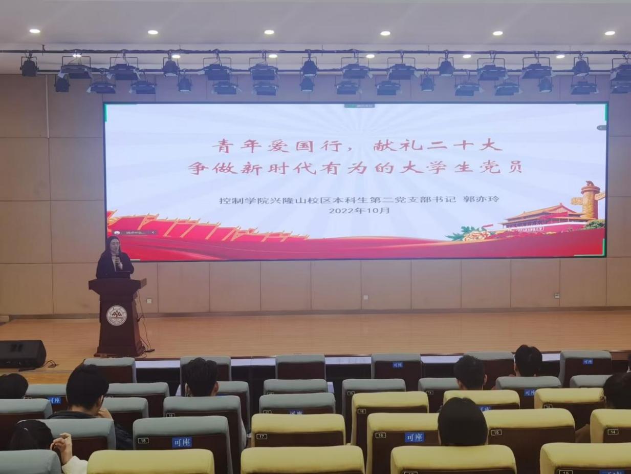 恰逢二十大胜利闭幕的关键时期,为进一步筑牢基层组织建设,明确入党流程与要求,深化重要精神内核,10月26日,控制学院于讲学堂101开展“青年爱国行,献礼二十大,争做时代有为的大学生党员”主题党课,控制学院兴隆山校区本科生第二党支部书记郭亦玲担任主讲人,全体预备党员和入党积极分子参与培训学习。