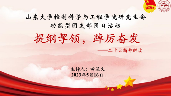 为了充分发挥控制学院研究生会功能型团支部的功能,进一步加大对团支部成员的培养教育力度,深入学习贯彻党的二十大精神,控制学院于5月23日上午在千佛山校区4号楼312活动室举办“提纲挈领,踔厉奋发——党的二十大精神解读”主题团日活动,控制学院研究生会功能型团支部成员参加。