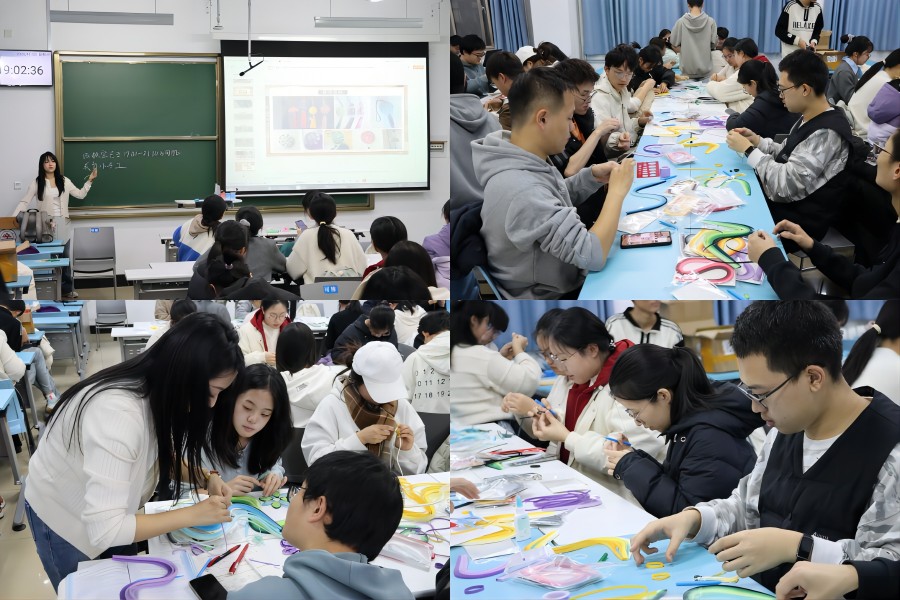 活动伊始,艾奕含系统介绍衍纸艺术的历史背景与文化价值,让学生充分了解这一传统手工艺术的起源与发展脉络。随后,艾奕含通过现场操作演示详细讲解衍纸制作的核心流程、技术要点及基础造型制作方法,为学生实践创作提供专业指导。实践环节中,学生领取材料后依规开展创作,将传统元素、现代设计与校园特色融入作品,展现出良好的创新意识与动手能力。