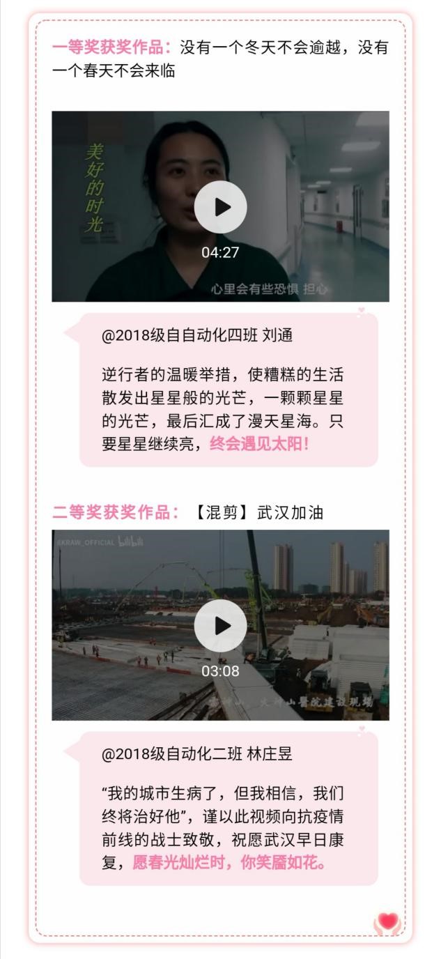 除了海报制作活动,控制学院学生工作委员会也积极响应团委号召,面向全体控院学生举办了视频制作比赛,通过视频的方式传递人文关怀,传播社会正能量。其中,以《没有一个冬天不会逾越,没有一个春天不会来临》为代表的五份作品以其中传达的凝聚力和希望脱颖而出。其他视频作品也饱含深情,充分体现了疫情面前中华儿女紧密团结的浓厚情谊,展现了控院学子在疫情防控期间积极向上、昂首向前的精神风貌,表达了控院人对一线工作者的关切和对疫区人民的牵挂之情。