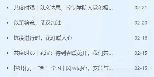 面对严峻的疫情,控制学院团委迅速行动,第一时间安排部署防疫工作,控院师生积极响应号召,通过海报视频制作、防疫知识宣传、健康学习生活打卡活动、编程声援武汉等方式传递温暖,助力疫情防控战役,同心协力、共克时艰,以个人的微薄之力,凝聚起众志成城的强大正能量。万人一心,犹不可挡,况十四亿乎。我们相信,黑暗终将被驱散,困难终将被克服,我们必将取得疫情防控阻击战的最终胜利。
