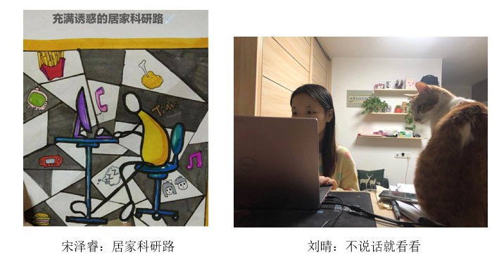 王同学说:带着毕业压力,踏上了在家写论文这条“艰辛”路。居家“诱惑”太多,刷微博、追网剧、看比赛,一不小心就过去两三个小时。自我监管欠缺,找小伙伴来帮助(爱猫:我不说话就看看),彼此根据自己的进度合理安排每天的任务量,大家互相监督互相鼓励。还有同学在家划分学习区和生活区,学习期间不玩手机,不看视频,每次尝试过渡十分钟,让自己尽快进入学习状态。刘同学感言:居家科研考验的是每个人的自律,今年的毕业季虽然“残酷”,但也会重赏自律的人。