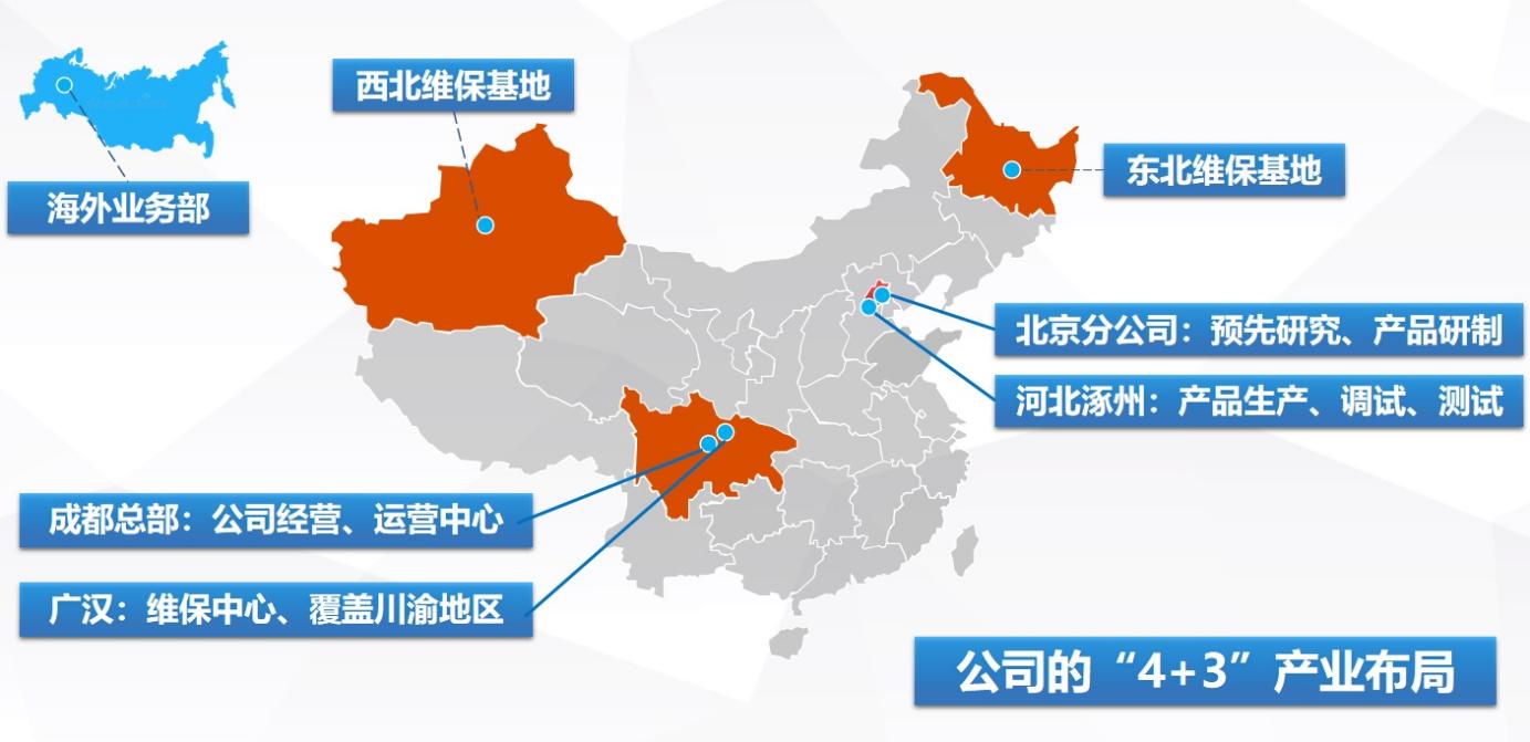 公司目前设立4个办公地点:成都总部、北京分公司、河北涿州生产基地、德阳广汉维保中心
