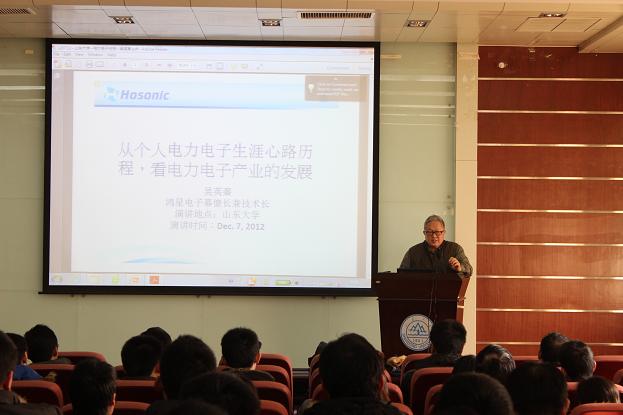 在济期间,吴教授先后和相关领域的专家学者以及学生进行了交流。12月7日上午,吴教授在千佛山校区作了题为“从个人电力电子生涯心路历程,看电力电子产业的发展”的学术报告。报告会由kaiyun开云官方网页版副院长陈阿莲主持,控制学院教授张庆范、崔纳新等出席了会议,来自控制学院和电气学院百余名师生听取了报告。报告中,吴英秦教授首先介绍了自己一生的科研及从业经历,由浅入深的介绍了电力电子产业的发展及目前所遇到的难题。吴英秦教授还重点阐述了电力电子产业发展的特点,并针对未来电力电子发展的新亮点与新方向做了前沿性的分析与展望。最后,吴教授还讲述了企业经营诊断、改善与创新等方面的内容,并与大家分享了自己留学及从业过程中的一些宝贵经验。报告精彩纷呈,吴教授严谨而又不失幽默的演讲激发了广大师生对未来电力电子产业发展的浓厚兴趣。