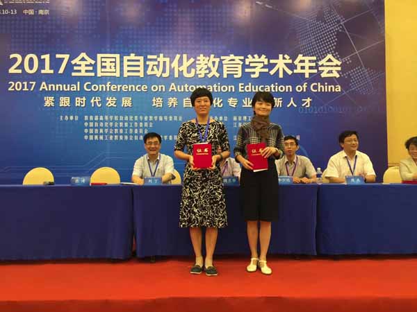 闭幕式上举行了优秀颁奖仪式,山东大学张承慧、陈阿莲等承担的教育部自动化专业教指委首批教改立项课题 “理工复合型自动化精英人才培养探索与实践”结题获优秀成绩。在教育部自动化专业教指委34个首批教改立项课题中只有清华,山大、浙大和厦大承担的4个课题获得优秀成绩。这表明山大理工复合试验班办对了,深受同行认可。陈阿莲代表山大课题组上台领奖。