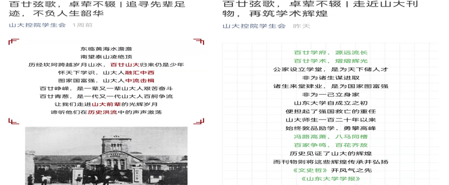 妙笔生花,共享人文精华。为创新美育形式,控制学院以山大控院学生会公众号为载体,开设了“百廿弦歌,卓荦不辍”、“控山心语home”、“兴隆山下”等线上美育版块,搭建更多更好的自我学习平台,以文字形式普及人文艺术等美育知识,在理工氛围浓厚的兴隆山不忘提升人文素养,激发和满足工科学生的兴趣。紧跟时事,推出百廿专题等栏目,进一步宣扬校史、党史知识,培养同学们的爱党、爱国、爱校情怀。线上线下并举,取得显著成效。