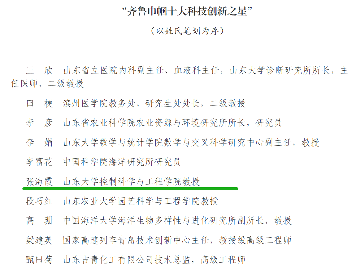 近日,控制学院张海霞教授荣获齐鲁巾帼十大科技创新之星。作为全院唯一获此殊荣的教师,张海霞教授努力践行科学精神,勇攀科学高峰,依循科研律谱,绘就巾帼华章,为学院教职工树立了尊重知识、崇实创新、热爱科学、献身科研的学习榜样。