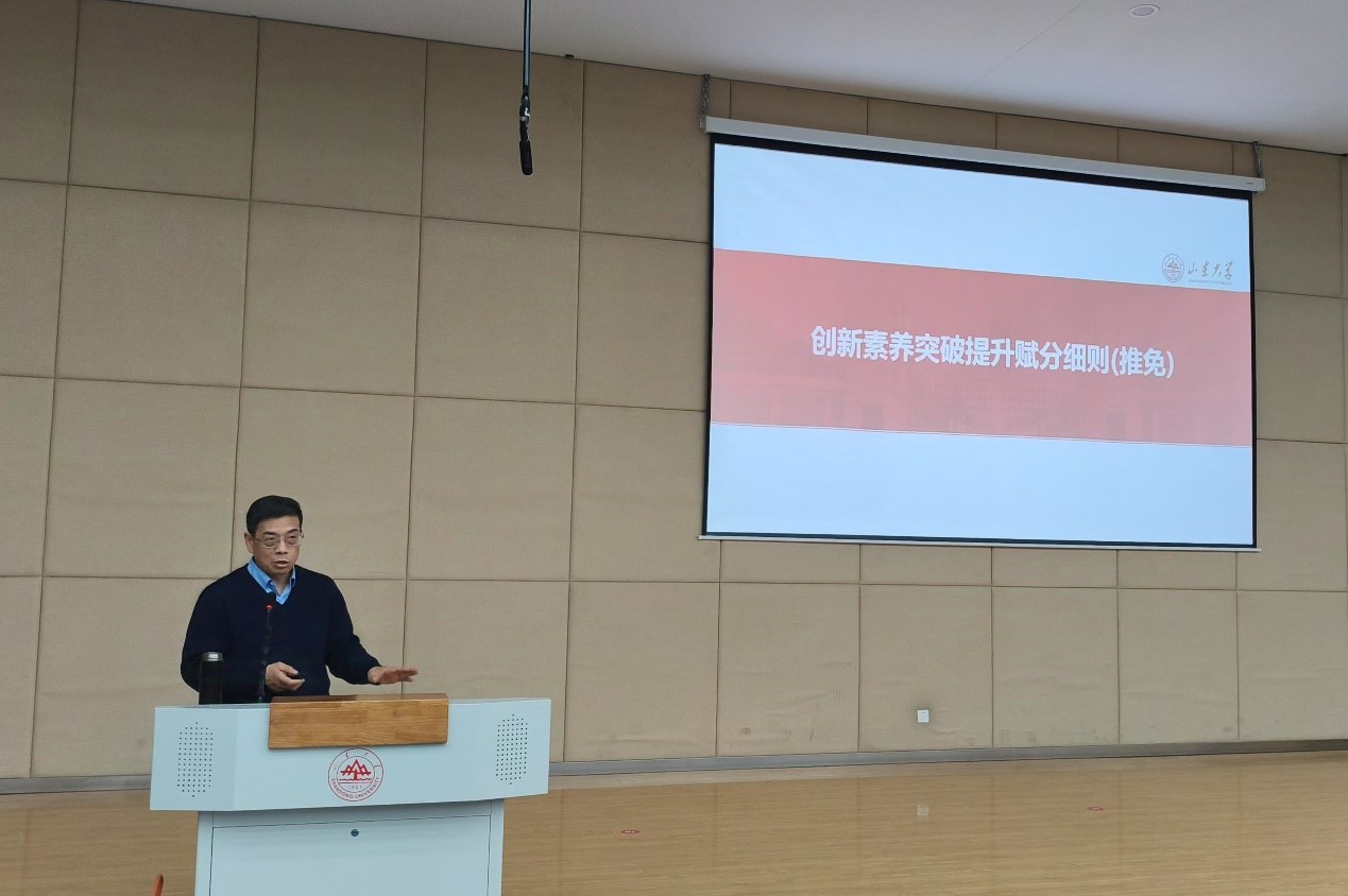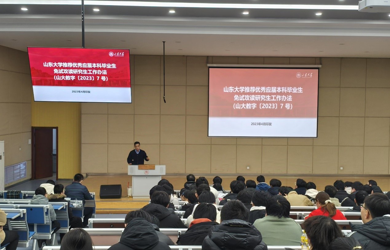 朱文兴结合习近平新时代中国特色社会主义思想以及新时代教育评价改革精神和立德树人根本任务,全面深入解读了《山东大学推荐优秀应届本科毕业生免试攻读研究生工作办法(山大教字〔2023〕7号)》,重点说明了推免排名方法、推免资格要求、推免生名额计划分配、推荐办法等学生高度关注的核心条款,并对下一届优秀毕业生推免遴选阶段的工作流程和大致时间节点做了相关介绍。他强调,各位同学一定要熟悉课程属性,认真核对专业培养方案与教务系统教学执行计划,提前做好自身学习规划,切实保障学业成绩满足和达到修读要求。