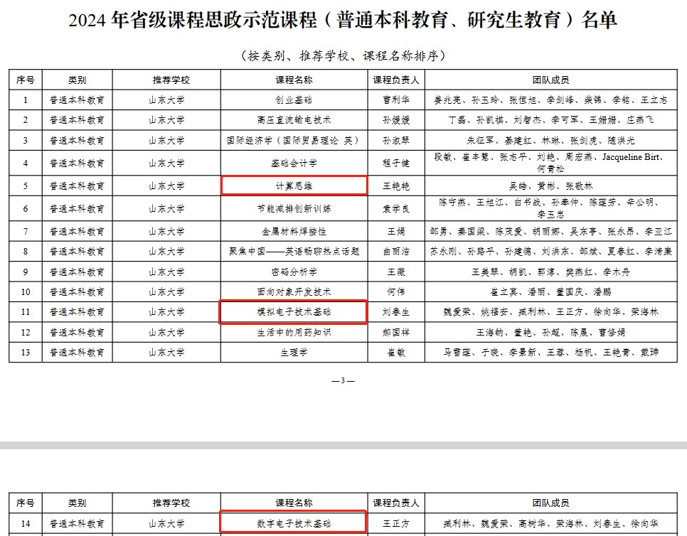 近日,山东省教育厅公布了2024年省级课程思政示范课程(普通本科教育、研究生教育)名单,控制学院《计算思维》《模拟电子技术基础》《数字电子技术基础》获评山东省课程思政示范课程。目前,控制学院共建设国家级课程思政示范课程1门、山东省课程思政示范课程7门、山东大学课程思政示范课程14门。